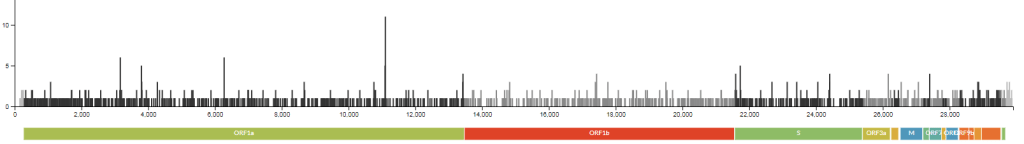 The picture above shows the length of the genome (0 to 29,000 bases) and the bars above show how many mutations have been detected at a given nucleotide. The long, color coded bars underneath represent the protein produced by that section of the virus.