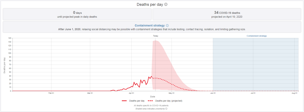 This period is allowing locations to slow the spread of the disease and minimize the total number of people sick at a time, known as the disease peak. Remember, we’re not just worried about deaths but about clogging up our hospital systems with patients who may need treatment for weeks at a time. The website covid19.healthdata.org/ has done a great job showing projected needs against the available number of resources. Below shows an image for Texas that shows a high availability of hospital and ICU beds, but a possible need for some ventilators in the state.