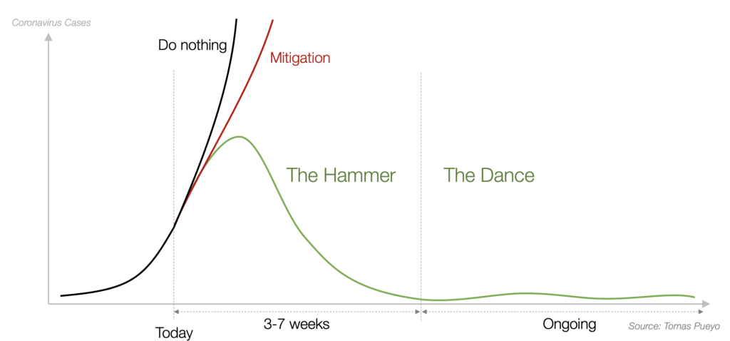 Enter “The Dance”, part two of the first graphic referenced. The dance is a way to buy time without maintaining the hammer. When testing has become widespread we will be able to locate all cases of the virus we will be able to quarantine those who have had the virus or are possible asymptomatic carriers, allowing everyone else to lead closer to a normal life. During the dance we will still be unable to hold large events such as concerts and sporting events, but we should be able to go out shop, eat, and do more normal activities so long as social distancing and hand hygiene are properly maintained.