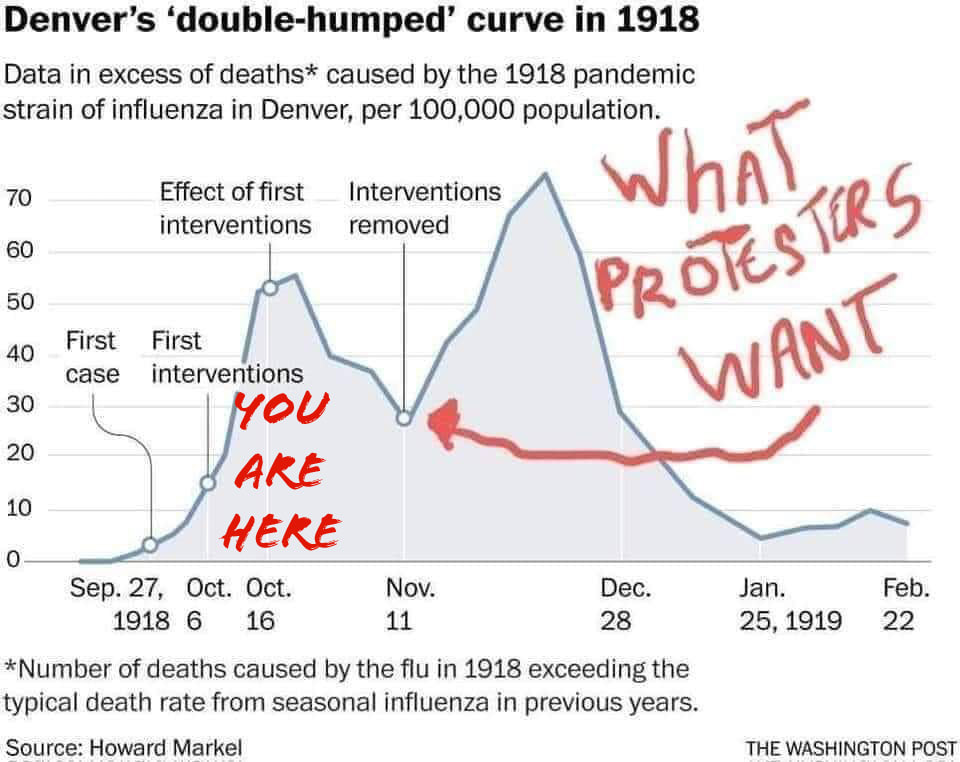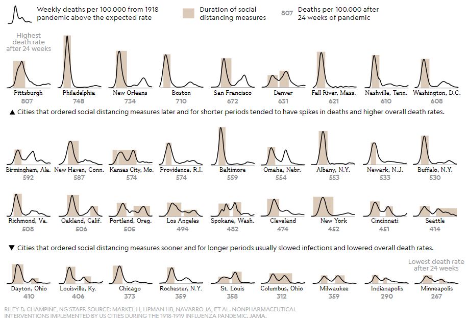 In this graphic the shaded areas represent the hammer. The main lesson we can learn from the past is that social distancing during the hammer period reduced the number of cases in every instance. Though what happened in Kansas City, Mo to cause the double peak with social distancing measures I have no idea, but the distancing did eventually work.