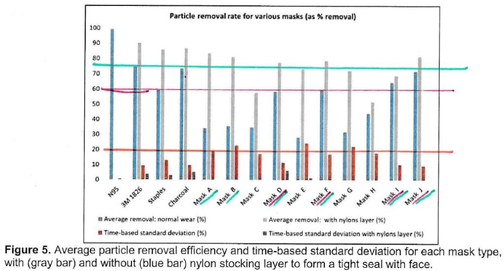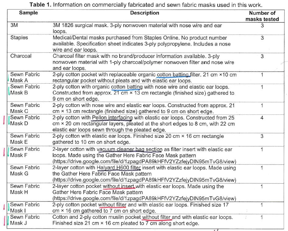 A variety of handmade masks were also tested, each showing improvement with nylon. Based on the descriptions, the masks were made to mimic surgical masks with multiple layers of pleated cotton. I have included the table listing the masks with my notes from the paper. The lines to the left of the mask show the benchmark they pass in figure 5.