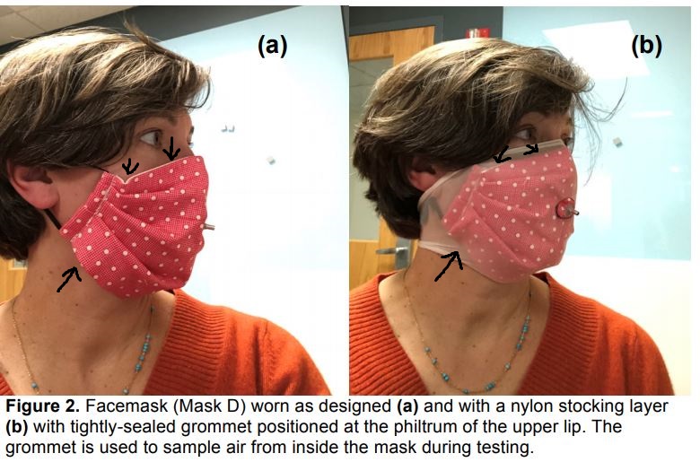 Dr. Fernandez recruited Dr. Mueller and the two of them worked with the Boston community to get masks, homemade and manufactured, for testing. A total of 13 styles of masks were reported on in the initial results, but as their web page says tests are ongoing we might learn more in the near future. While these searches were ongoing, Dr. Fernandez spoke with her colleagues about mask use and Dr. Price, director of the Office of Environmental Health and Safety, informed her of the use of pantyhose in the 1980s to secure masks to peoples’ faces.