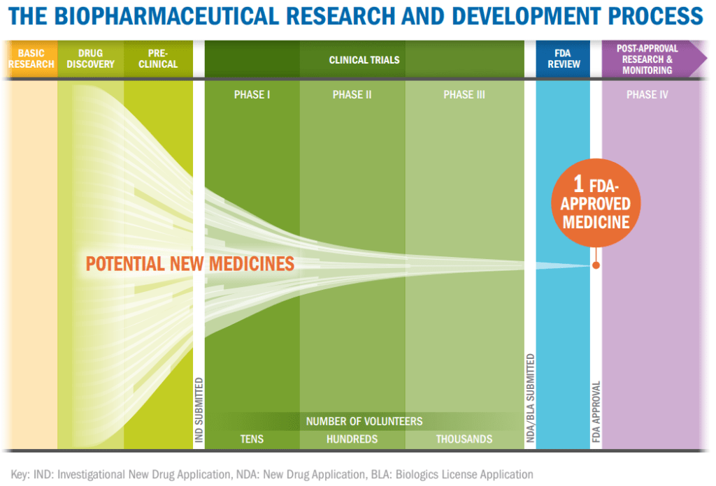 Once all of the information is documented and collected, it gets send to the FDA for approval to move to human trials. For every 1,000 candidates that are identified during research, only 2-4% of those drugs ever make it to pre-clinical testing. From the drugs in pre-clinical testing only half are granted permission to begin clinical trials. [link]
