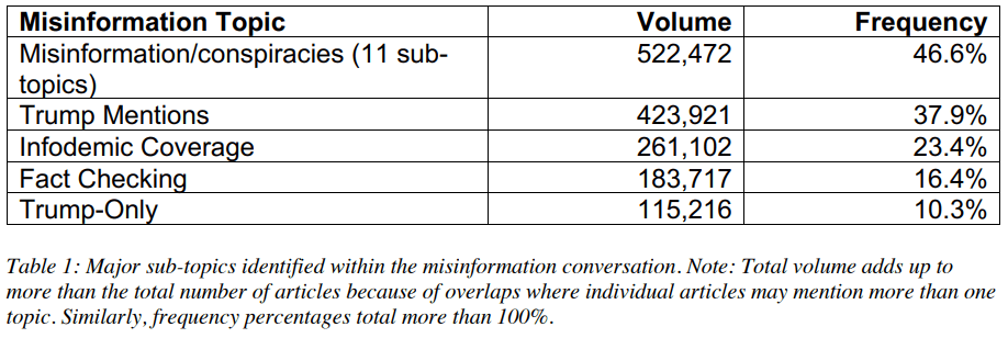 Articles were separated into 5 overlapping categories of Misinformation/conspiracies, Mentioned by Trump, Infodemic Coverage, Fact Checking, and Trump-Only. While the exact reason is not stated, since before his presidency Trump was known to spread conspiracy theories and his current status is likely the reason for inclusion as a category in the study. The Misinformation/conspiracy section was separated into 11 sub-topics displayed in the paper’s figure 3 above.