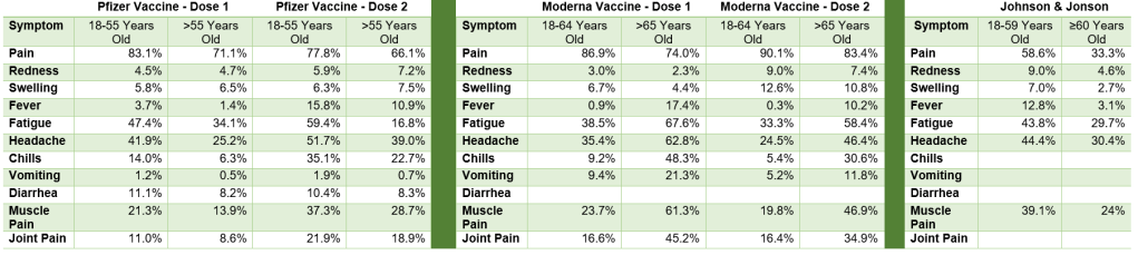 With the release of the Johnson & Johnson vaccine, we’re able to compare the side effects of the different vaccines. While there’s less data to include on the table, it’s obvious that the J&J vaccine can be the gentler option for people worried about side effects. Another benefit of the J&J vaccine is that it only needs a single dose. This allows it to be more easily given to people who have difficulty in traveling such as the elderly or isolated populations. This vaccine is simply more convenient as it can cause milder reactions, can be stored at normal refrigeration temperatures, and be fully administered with a single shot. [link]